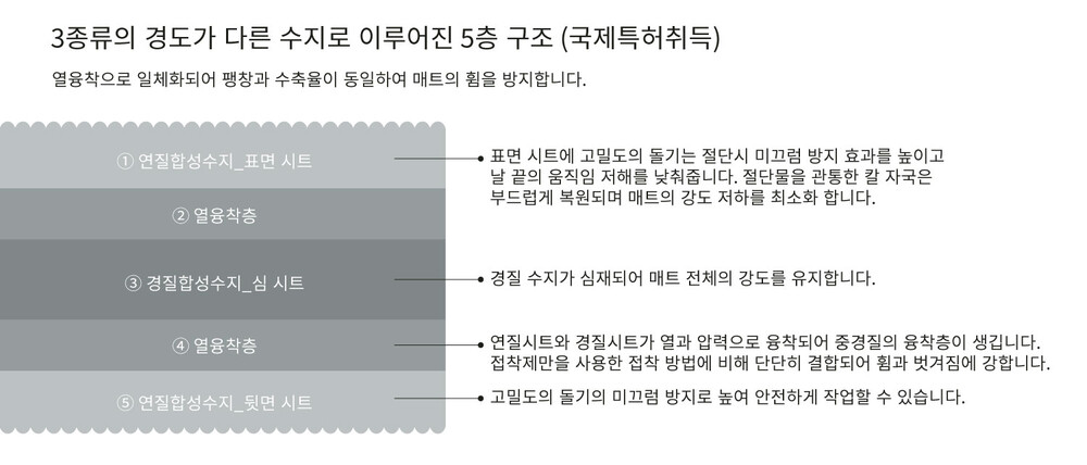 MIWAX 커팅매트는 5층의 구조이며, 3mm의 얇은 두께에 불과하지만